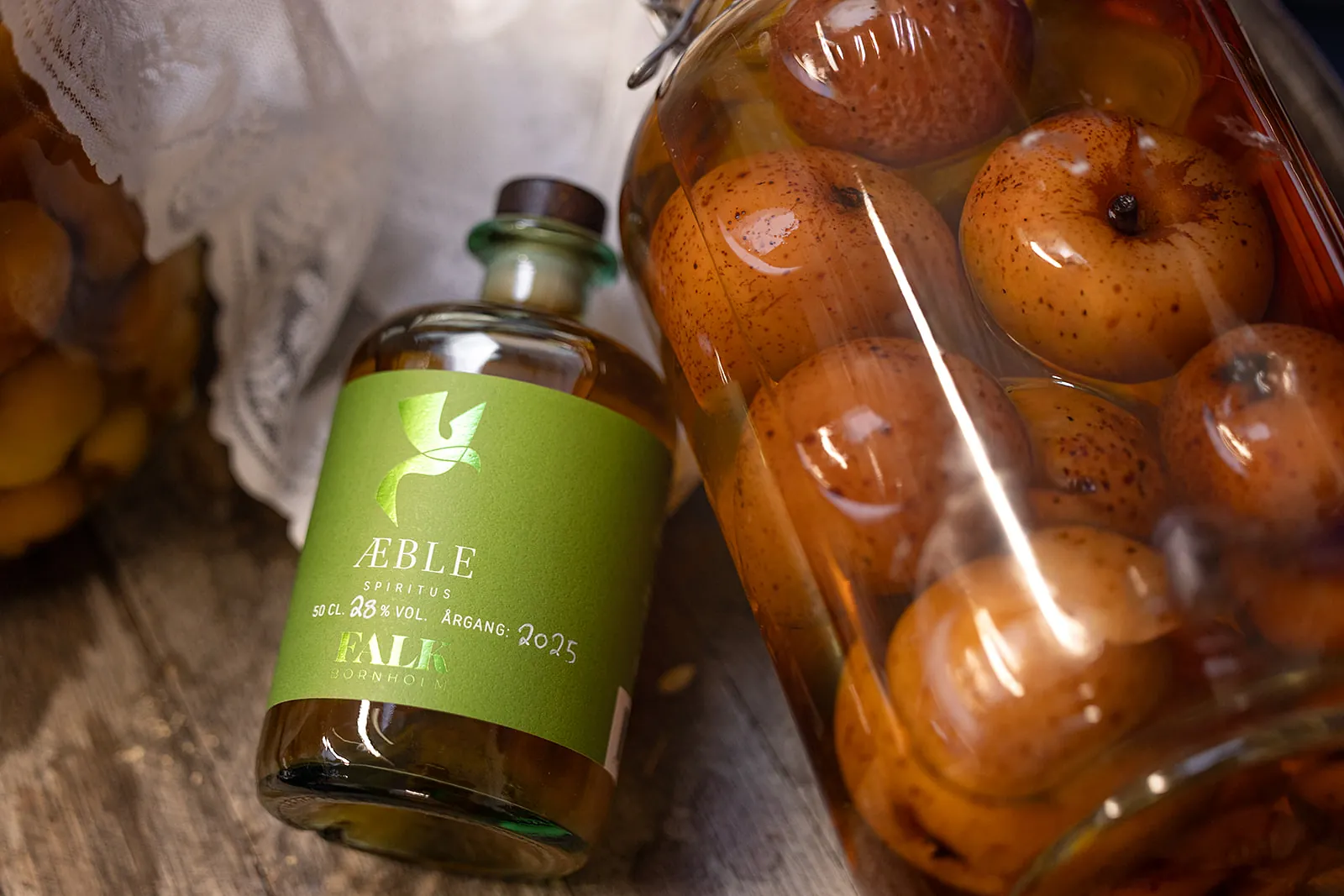 Æblernes saft og smag er trukket ud af de solmodne æbler i spiritussen.